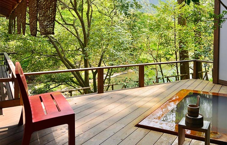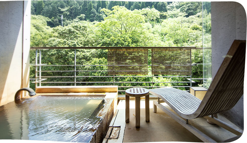 돌벽에 ‘아모리가와 강’을 바라보는 위치에 원천 방류식 노천탕이 딸린 객실.